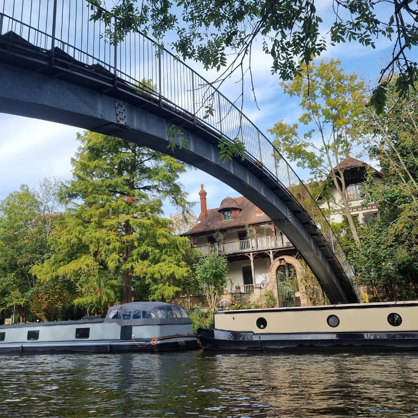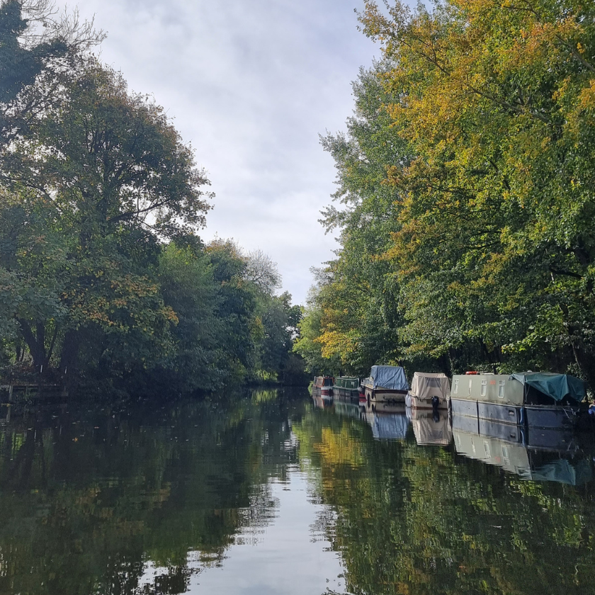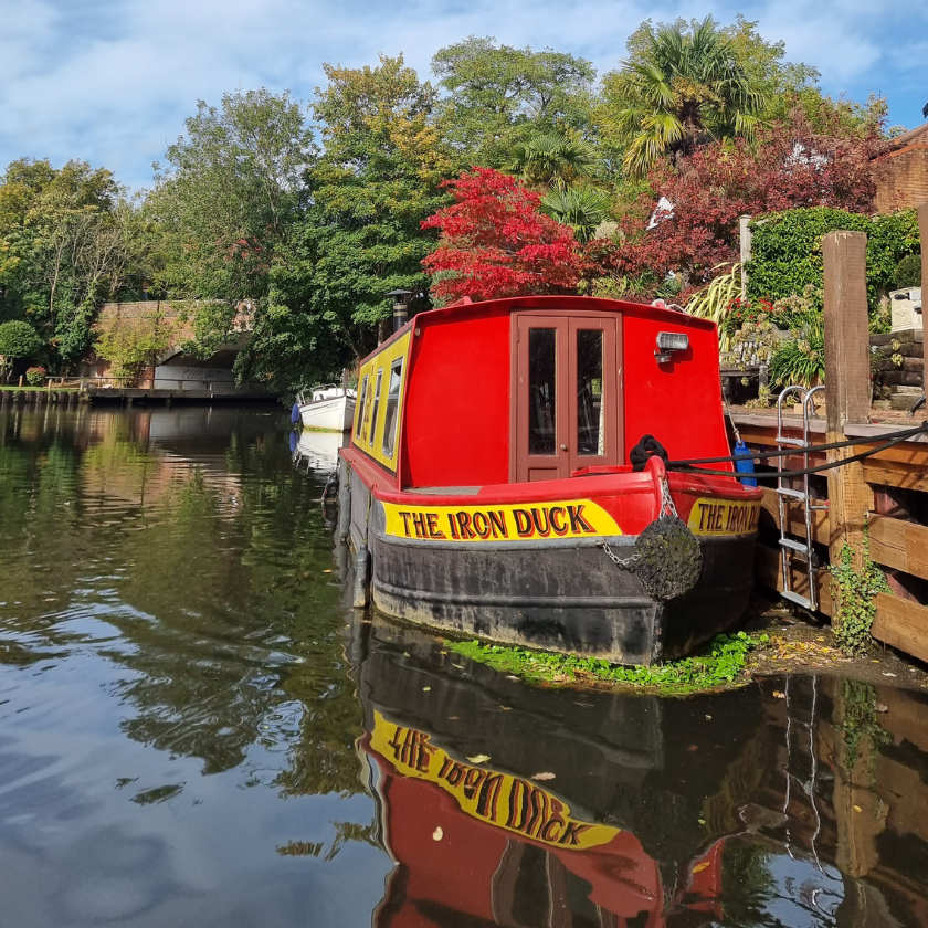 A lovely autumn’s day, we explored the meandering backwaters of the Wey. The shallow section to the left at Wey Bridge was ideal for paddling. Clearly an affluent Surrey neighbourhood: huge mansions, bungalows, villas and manicured gardens stretched all the way down to the water. The odd colourful, quirky narrowboat resided next to the extravagant yachts. I smiled at the ‘Neighbourhood Watch’ sign on a tiny uninhabited island with a colony of ducks. Past the sweeping reeds and overhanging trees, there were green meadows and even fields with grazing cattle. I did not expect this kind of rural tranquility and serenity. Only 30 minutes from London!