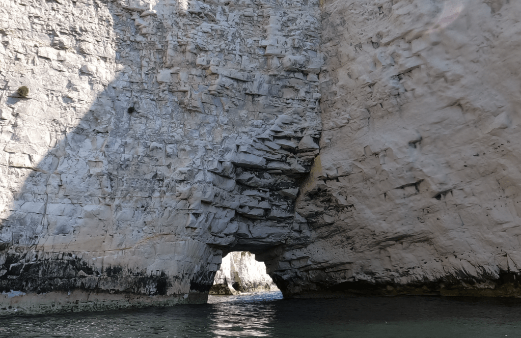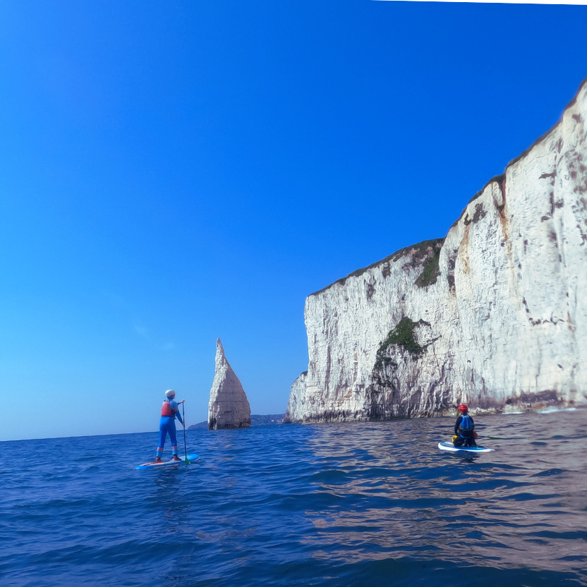 Navigating the choppy coastline, we gradually find our stride amidst the rhythmic waves. Farewell to touring on chubby inflatables, for we embrace the graceful glide of hard boards! Led by Elliott, we explore the sparkling waters, drawing ever closer to Old Harry himself. Equipped with helmets for safety, we venture through narrow passages between the rocks and cliffs, immersing ourselves in their ancient presence. Time has shaped them, weathered them into natural works of art. Here they stand, guardians of the coast.