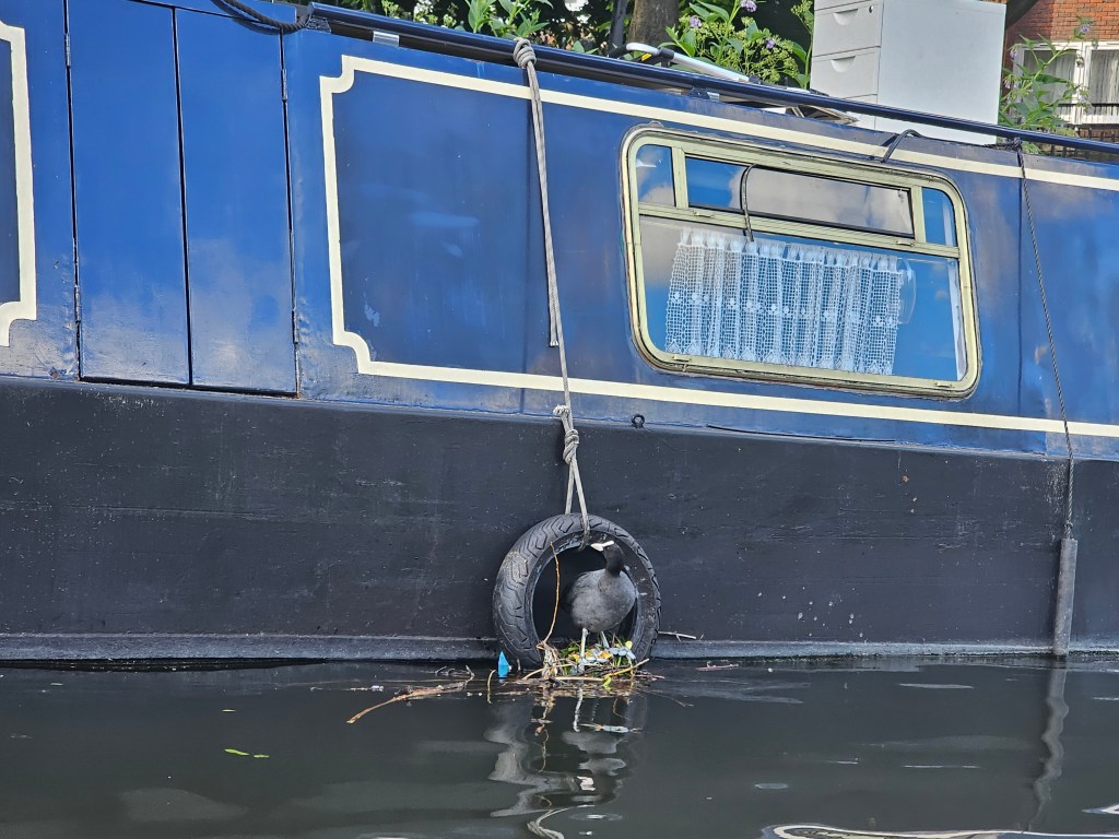 Nature has serious resilience. This coot built its nest inside the tyre that’s being used as a fender. And by law, if birds are nesting on a boat, that boat can’t move until the chicks have fledged.
