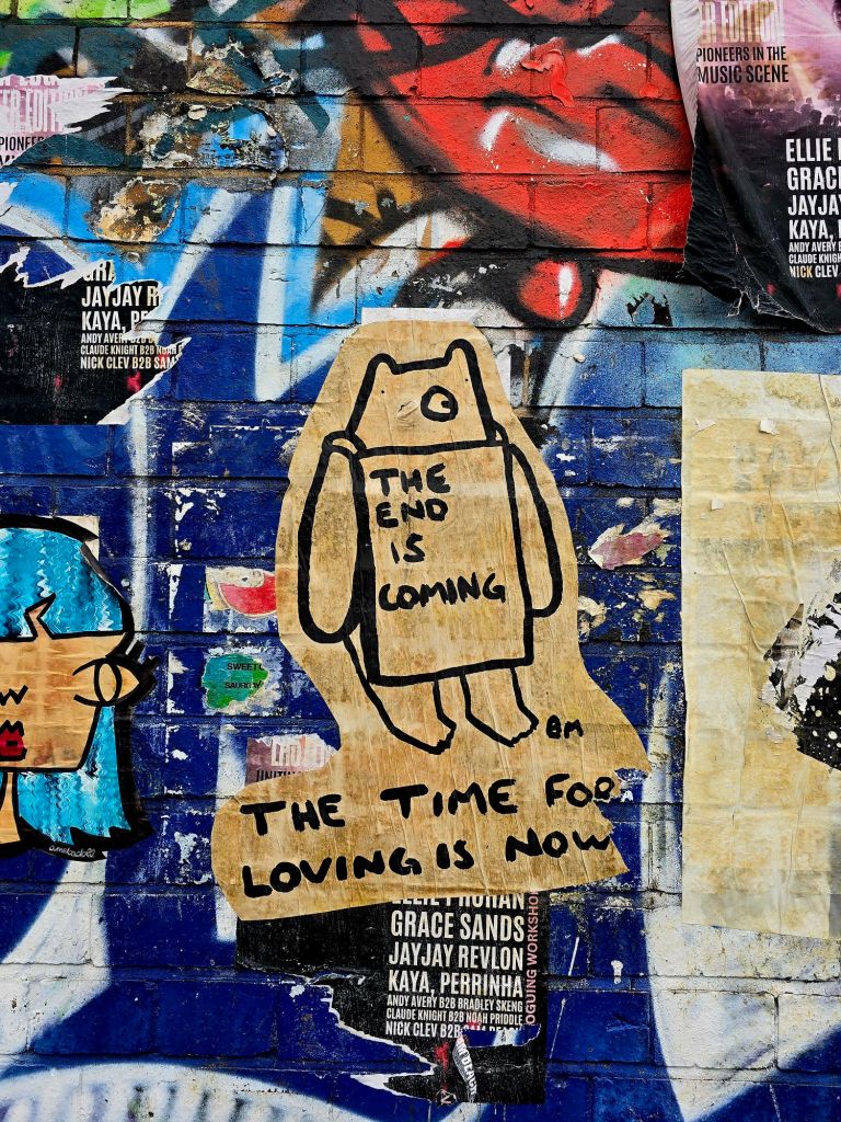 3. This paste-up in Hackney Wick made me pause: “The end is coming. The time for loving is now”. Glued over an already busy graffiti wall, the message felt urgent but also oddly gentle.